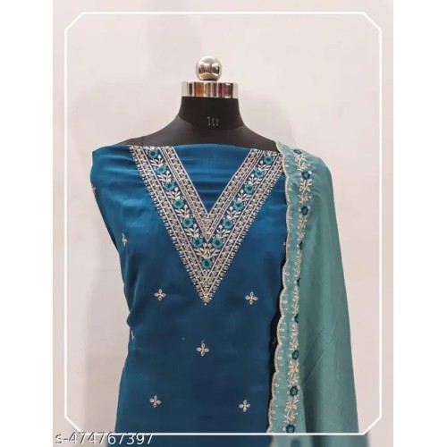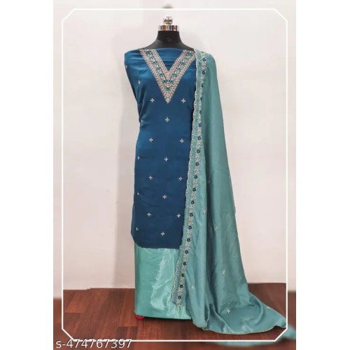 Product DetailsName : Bliss Flair Blue Vichitra Silk Embroidered Dress Material For Women With Heavy Neck And Lace (Unstitched) Dress material pakistani suit pakistani suit simple dress material suit cotton suit churidar material salwar suit suit for womenTop Fabric : Vichitra Silk + Top Length: 2.25 MetersBottom Fabric : Shantoon + Bottom Length: 2.25 MetersDupatta Fabric : Vichitra Silk + Dupatta Length: 2.1 MetersLining Fabric : No LiningType : Un StitchedPattern : EmbroideredNet Quantity (N) : Singlepakistani suit pakistani suit simple dress material suit cotton suit churidar material salwar suit suit for women. Pakistani trending suits have created a in the Indian fashion industry Patiyala suits originated from the Patiyala region of Punjab Traditionally worn by Muslim brides, these suits often come in heavily embellished designs and patterns. The Dupattas are also quite heavy and have intricate Zari or mirror work to match the pattern of the suit Party Wear Suit , Best Deal Suit , New Arrivals , Work Wear Suit , Fresh Collection , Unstiched Suit , Patiala Suits ' Engagement Womens Suit , Sangeet Womens Suit , Wedding Womens Suit , Daily Wear Suit , HaldiFunction Wear Suits All Occastions Wear Suit Latest Unstitched dress material have Self Design,Embroidered,Floral Pattern With Sequence Thread work embroidery suit fabric. It Is Available In Free Size And Can Be Stitched To Suit Your Measurements.Country of Origin : India
